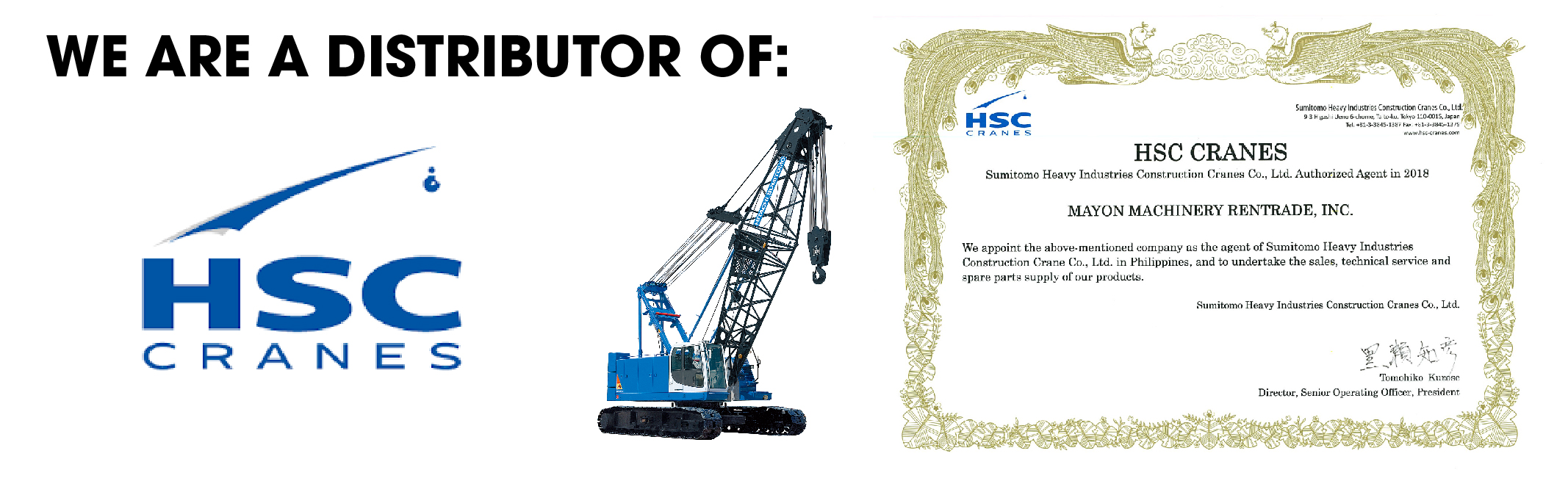 As time has gone on, MAYON MACHINERY has continued to grow its rental business in Philippines market since 2014. With the aim to be the leading solution provider to the construction industry, the distributor agreement between MAYON and HITACHI SUMITOMO (HSC nowadays) has been settled to expand the market with innovative technologies and high-quality products. Bring crawler cranes from HITACHI SUMITOMO, MAYON MACHINERY expects to deliver excellent mobility machines over soft surfaces from construction to civil engineering and port cargo handling. Under the term of the distributor agreement, MAYON MACHINERY will have sales and marketing rights to HITACHI SUMITOMO’s Crawler Crane Lineup in the Philippines.