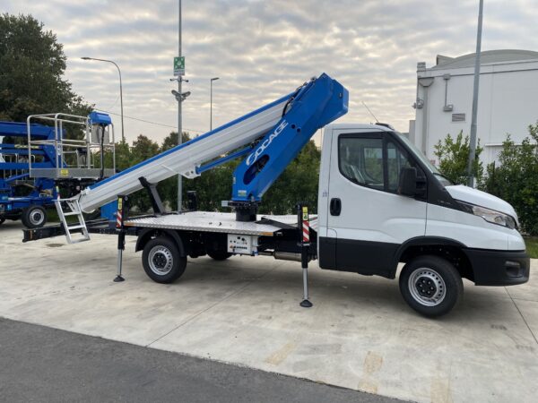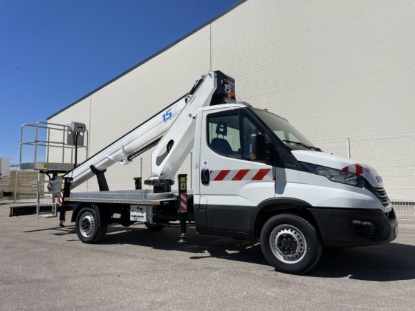SOCAGE forSte 15T SPEED is a bucket lift truck-mounted telescopic platform with automatic stabilization as standard. It can provide up to 15.20 m high and 10 m of outreach with a basket payload of 230 kg.