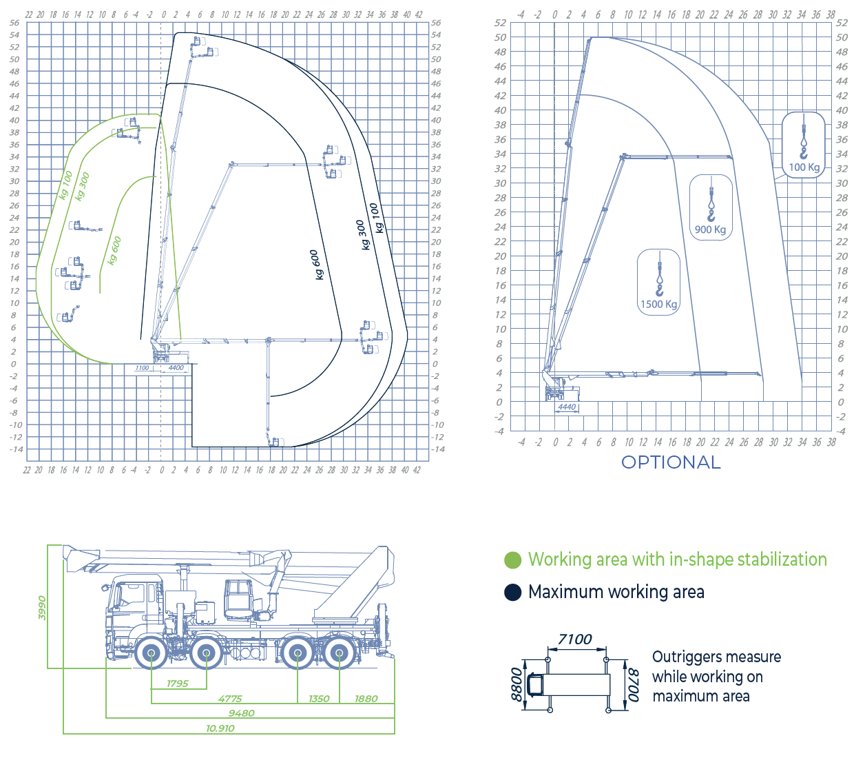 Equipped as standard with a multi-zone stabilization system that allows the operator to choose between different options depending on the available space for the truck; In addition, the rear stabilizing cross members of the new 54TJJ consist of 2 hydraulic extensions that increase the stabilization area and, therefore, the maximum performance of the equipment.