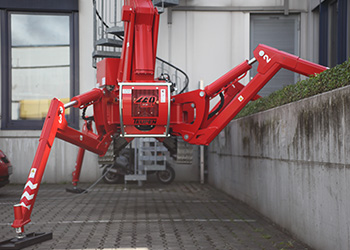 High-performance stabiliser systemSafe positioning even with little space: The multi-position stabiliser system permits to automatically set up the machine in confined areas and on slopes. It offers three different setup positions: Both sides wide, one side wide and one side narrow or both sides narrow. In terrain or over obstacles the stabilisers overcome a height difference of 1,20 m. |