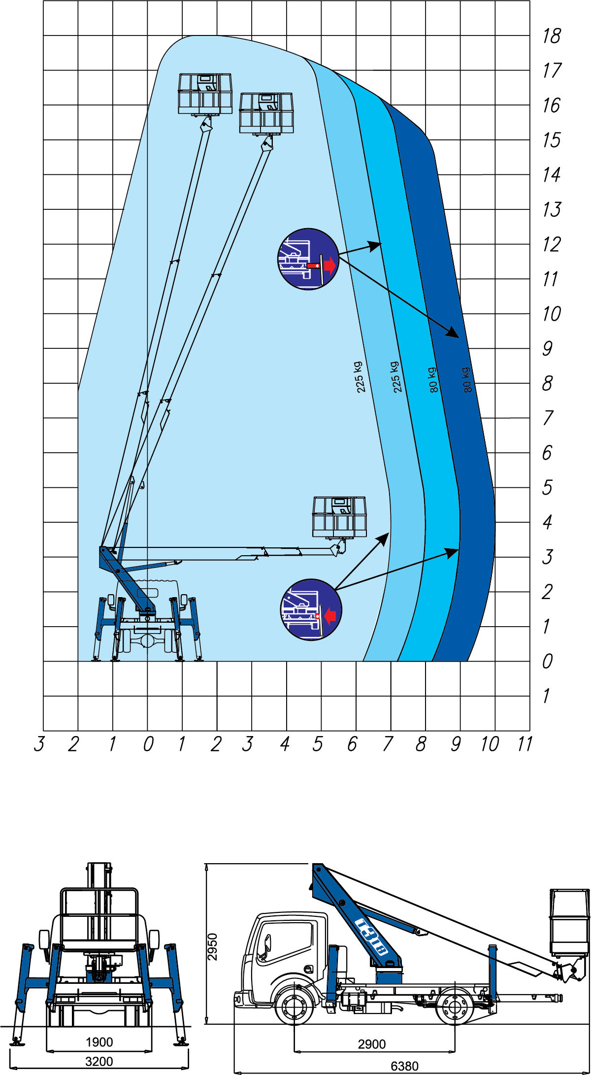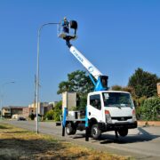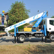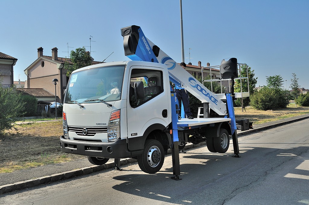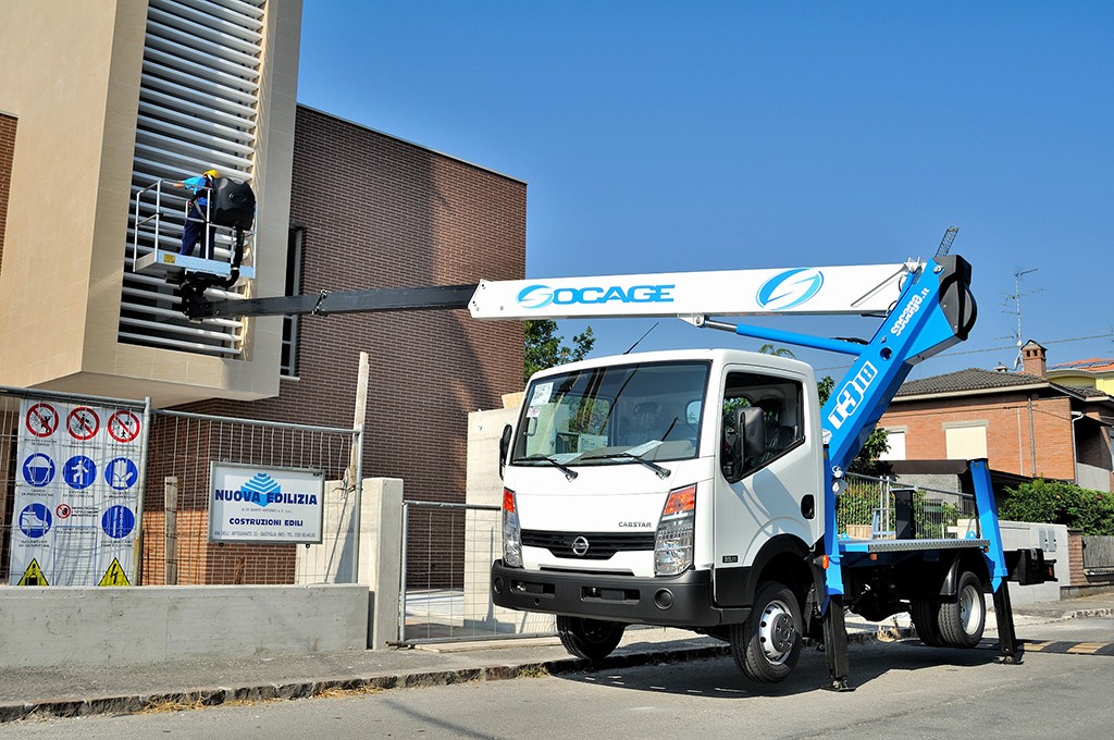 Truck-mounted hydraulic hoist (truck-lift) SOCAGE T318 forSte on the chassis of 3.5 tons is designed for lifting workers with tools and materials to a height of 18.0 m for construction, installation, repair, and other works. Boom design of SOCAGE T318 forSte – 3-section telescopic boom box section. The Italian truck-mounted booms SOCAGE T318 forSte are made of high-strength European structural steel Strenx 700, which reduces the weight of the equipment and increases durability and safety. Cradle has the ability to rotate 90 degrees to the left + 90 degrees. to the right of the axis of rotation, which provides additional comfort and convenience at work and increases the service area. The SOCAGE T318 forSte aerial work platform is equipped with an insulated cradle that allows the operator to work on power and communication lines at voltages of up to 1000V without cutting off power.